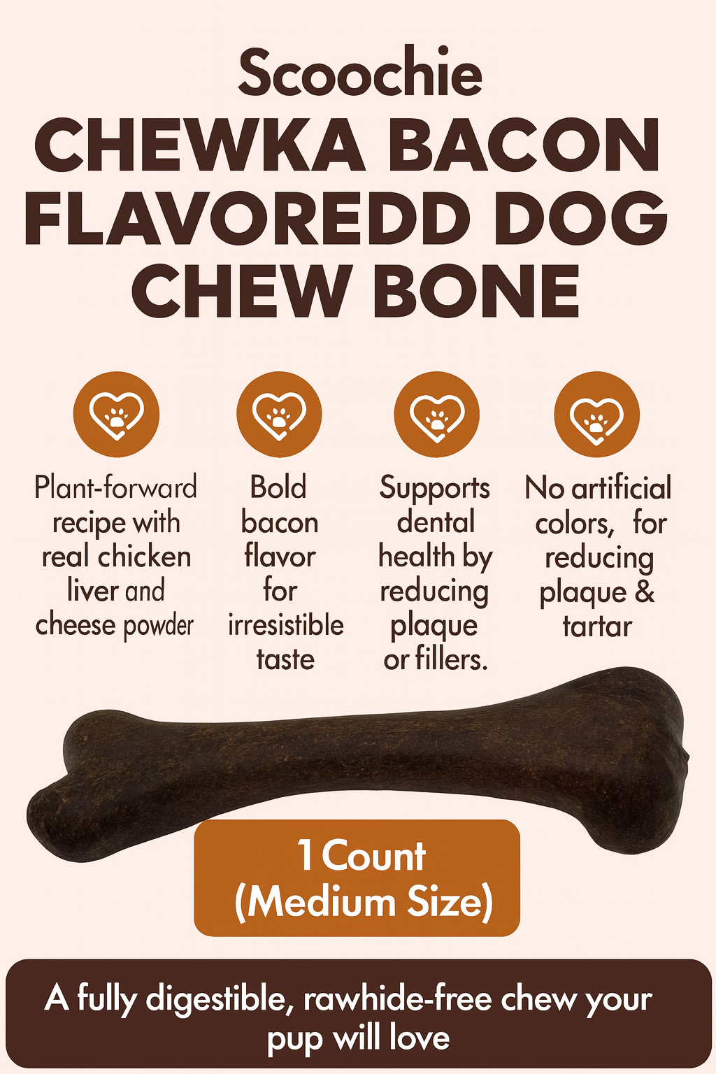 Give your dog a guilt-free chew that’s bold in flavor and gentle on digestion. Scoochie’s Chewka Bacon Flavored Dog Chew Bone is crafted with a plant-forward formula and infused with real meat, delivering a savory bacon taste dogs love. Fully digestible and rawhide-free, it’s a smart choice for pet parents who want clean ingredients and lasting satisfaction.