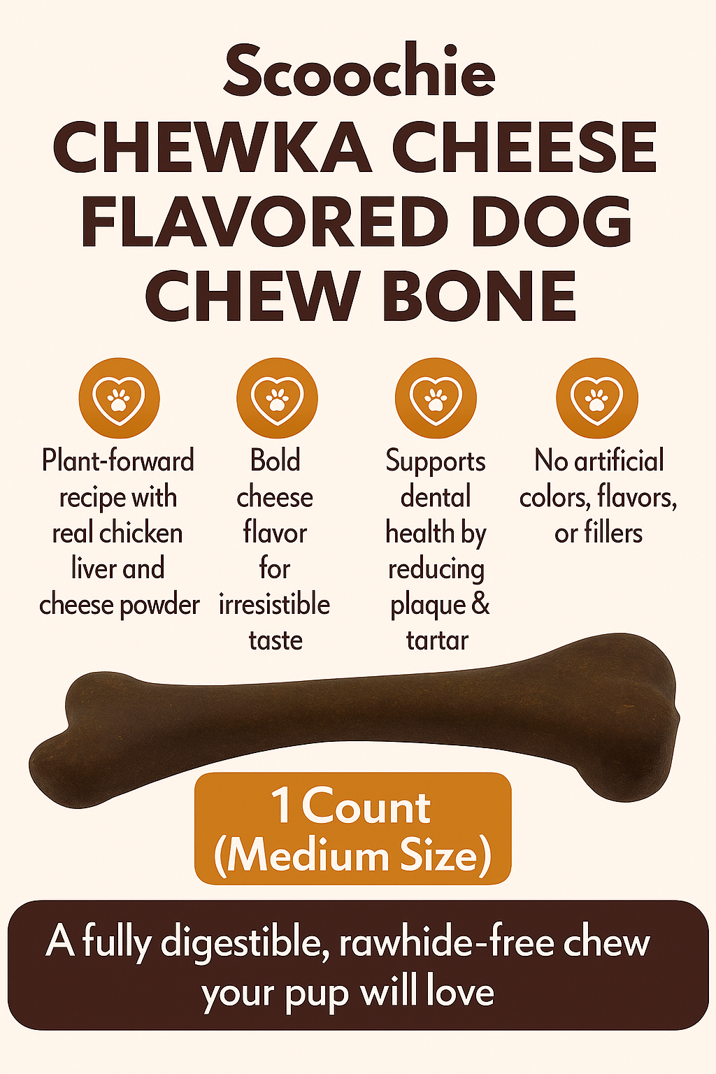 Give your dog a guilt-free chew that’s bold in flavor and gentle on digestion. Scoochie’s Chewka Cheese Flavored Dog Chew Bone is crafted with a plant-forward formula and infused with real meat, delivering a savory bacon taste dogs love. Fully digestible and rawhide-free, it’s a smart choice for pet parents who want clean ingredients and lasting satisfaction.