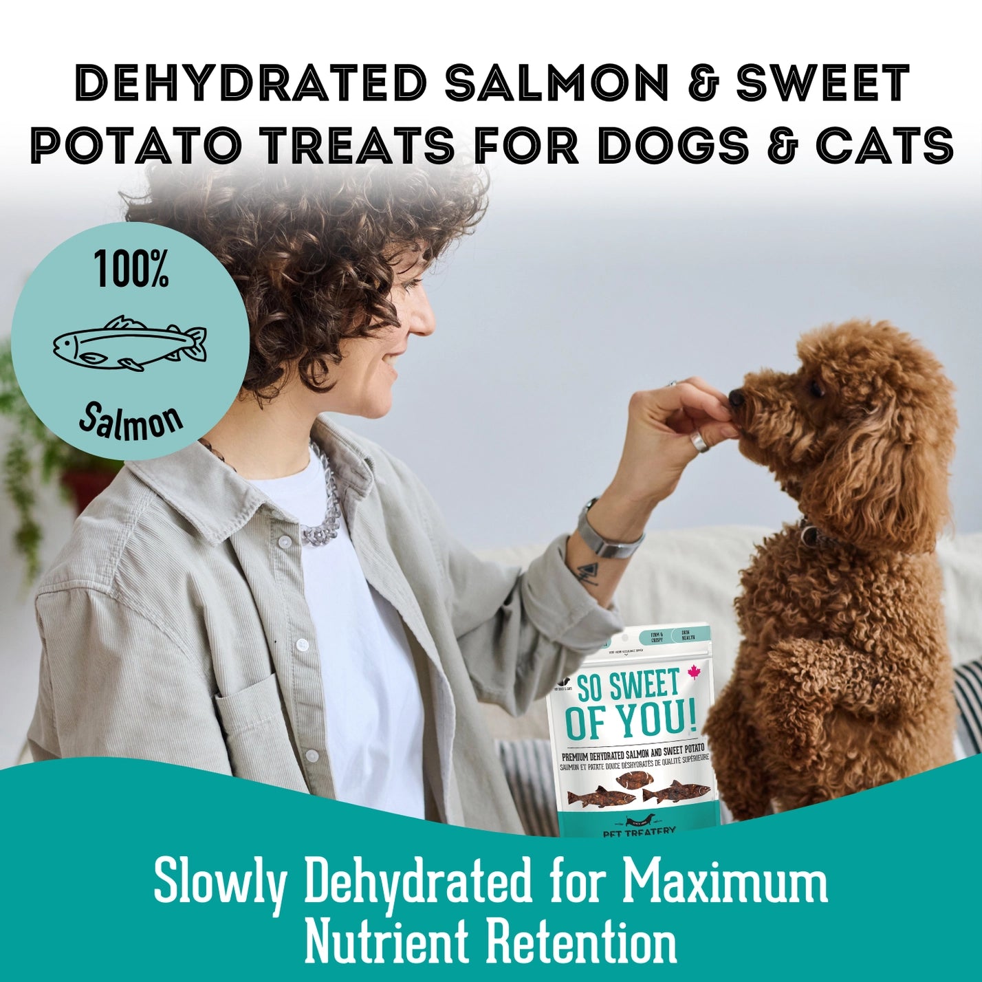 Treat your dog to a delicious and healthy snack with So Sweet Of You! by Pet Treatery. Made in Canada with just two premium ingredients—wild salmon and sweet potato—these treats are slowly dehydrated to lock in nutrients, flavor, and freshness.
